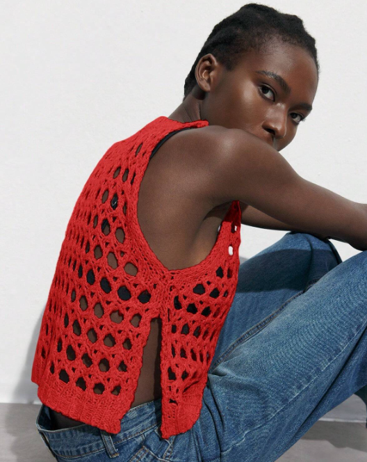 • «Maija Blusa corta de punto sólida con cuello redondo, calada y transparente, con abertura lateral, uso casual diario para mujer.
