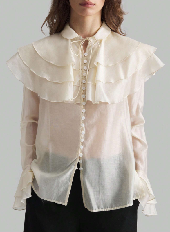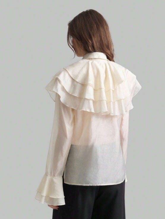 • «Ontre Blusa elegante de manga larga para mujer con diseño de cordones, botones, volantes y estilo retro palaciego, de tela semitransparente en color albaricoque, con cuello de volantes superpuestos, prenda sofisticada para otoño.