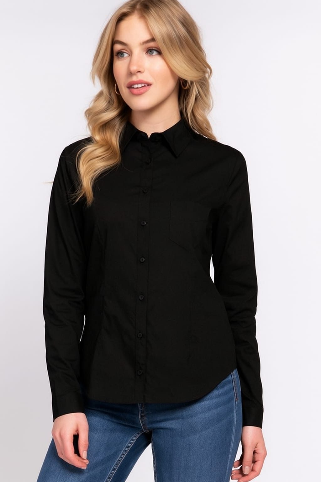 • CAMISA DE POPELINA ELÁSTICA DE MANGA LARGA CON BOTONES. NEGRO