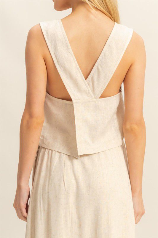El top sin mangas de corte limpio realza los hombros con elegancia, mientras que la falda cruzada con nudo o abertura frontal aporta movimiento, sensualidad sutil y un toque envolvente que favorece cualquier silueta. Una propuesta ideal para días soleados, citas o eventos informales con estilo