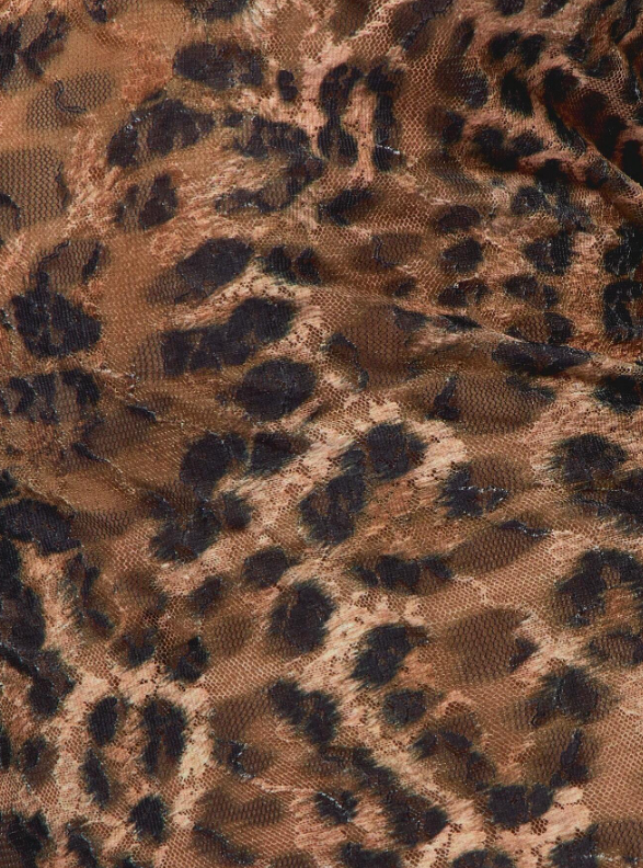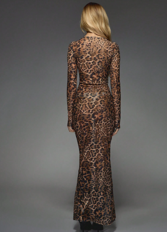 Este vestido largo de MISSGUIDED es una pieza audaz y elegante que no pasa desapercibida. Su estampado de leopardo, combinado con las mangas largas de malla translúcida, aporta una estética salvaje pero refinada.